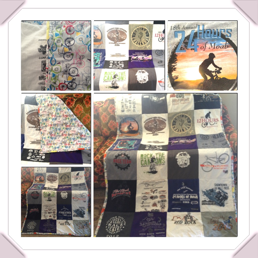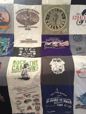 | My very good friend is a cyclist and so I decided to make her a quilt using all of her t-shirts from various races she experienced throughout the years. Here is a look of the final product |