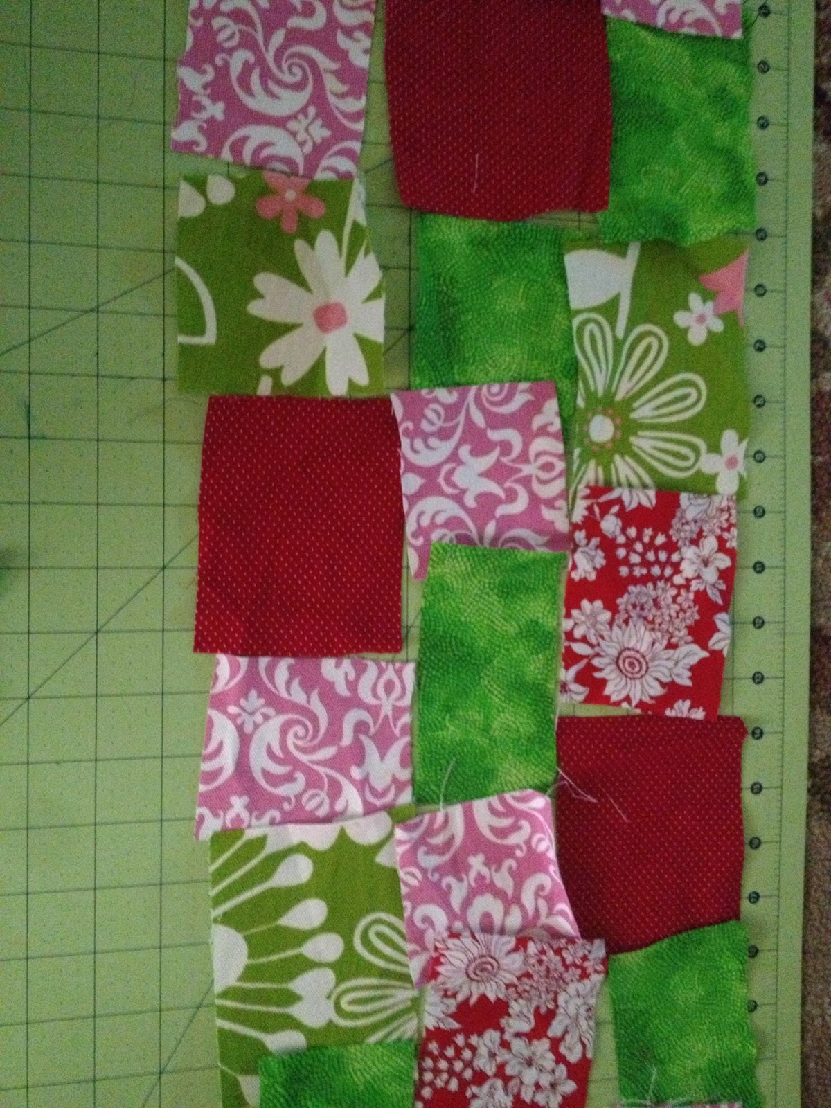 Sew each piece to the next, right sides facing each other using 1/4 inch seam allowance until you have all 3 rows completed. For the bottom strip, now would also be a good time to hem the side that will be used as the bottom end.